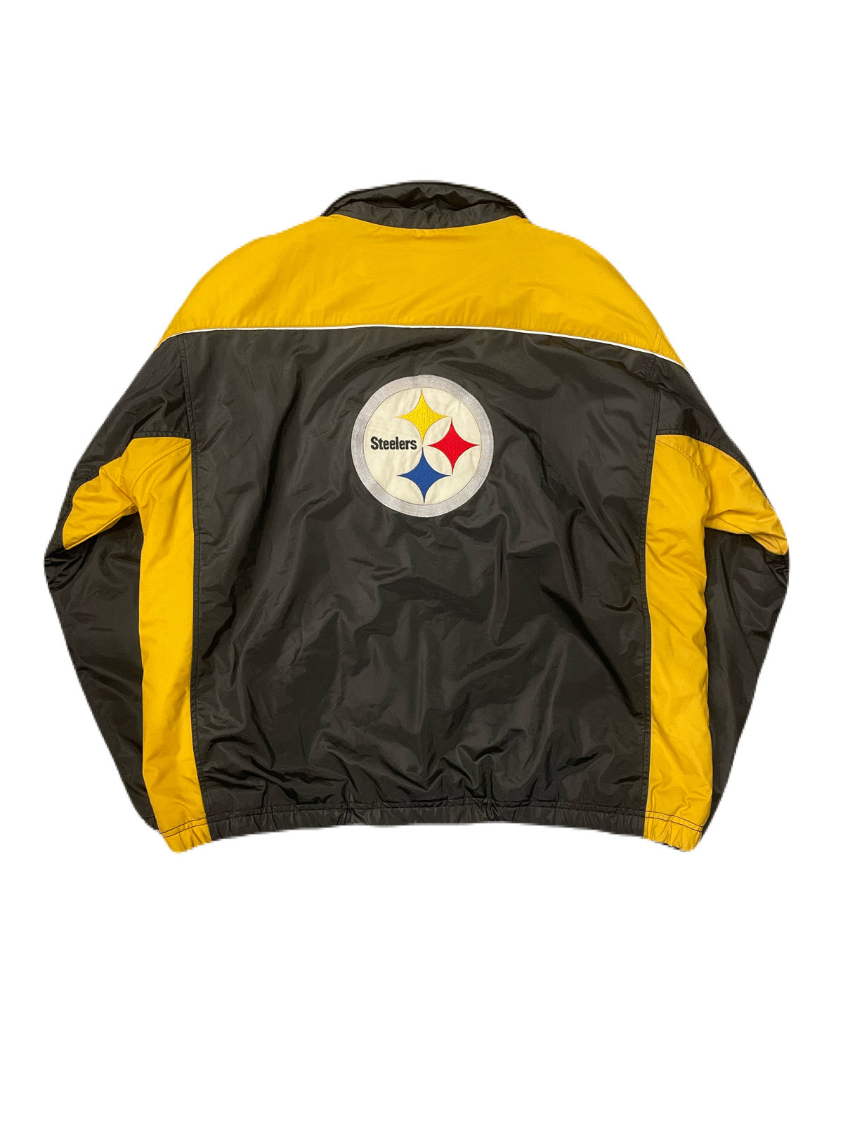 NFLに所属する名門チームSTEELERSのジャケット。左胸と背中にSTEELERSのロゴ刺繍あり。左腕と首元に破れあり。