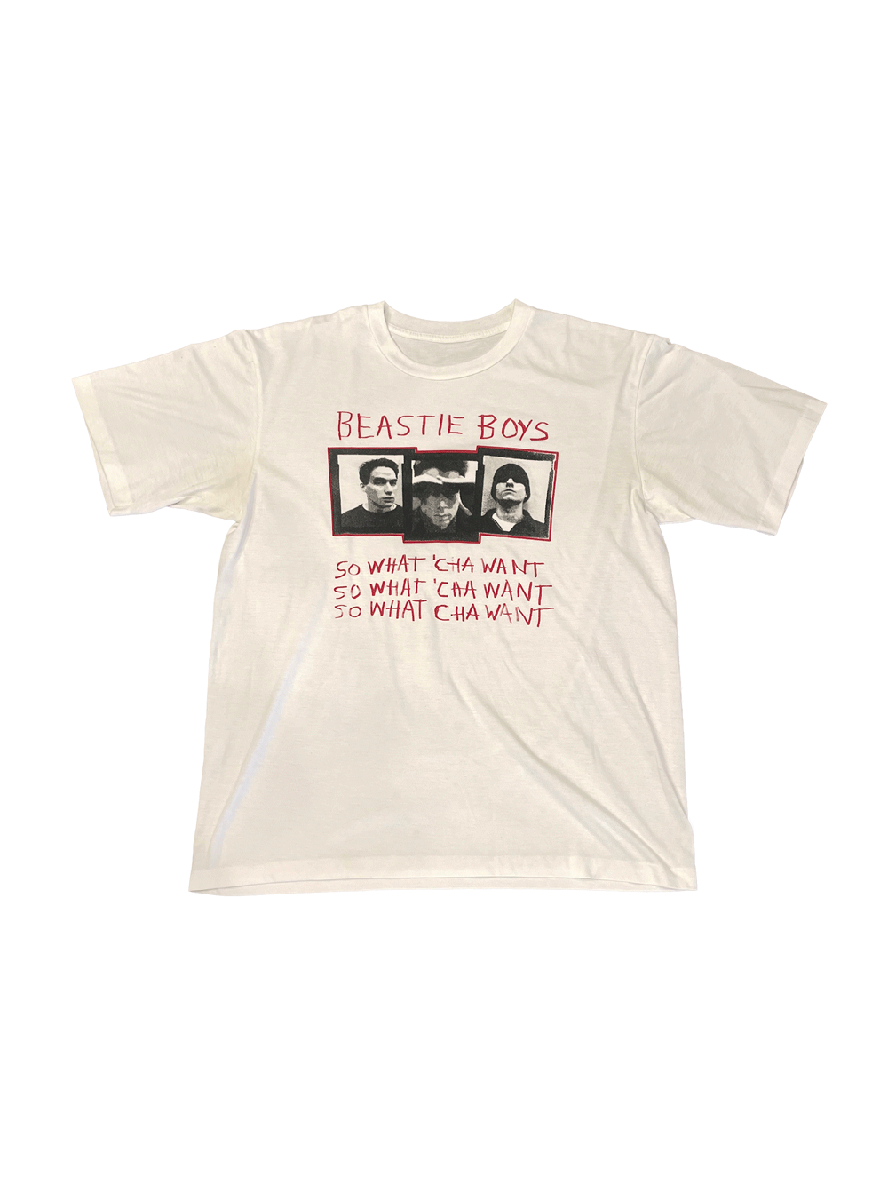 1980年代初頭から活躍した米ニューヨーク出身の白人3人組ヒップホップグループのBEASTIE BOYSのTシャツ。1992年にリリースしたSo What'Cha Wantのグラフィック。袖と裾ともにシングルステッチ。