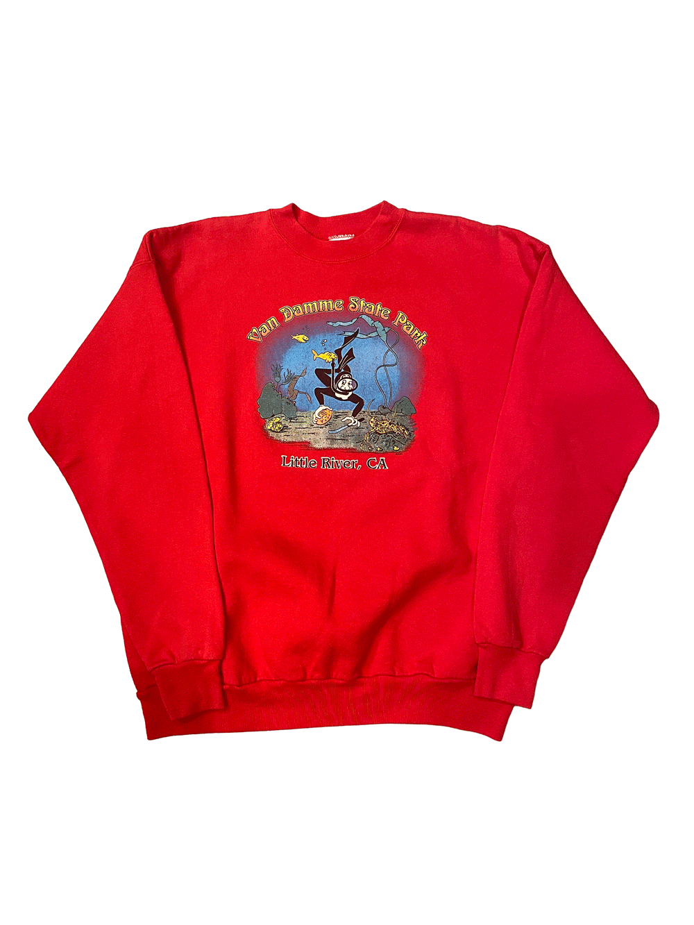 カリフォルニア州メンDocino郡にあるVan Damme State Park(ヴァン・ダム州立公園)のスウェット。リトルリバーという町の近くに位置する美しい海岸公園で、小川(リトルリバー)が太平洋に注ぐ場所、トレイル、ビーチが楽しめる人気スポット。